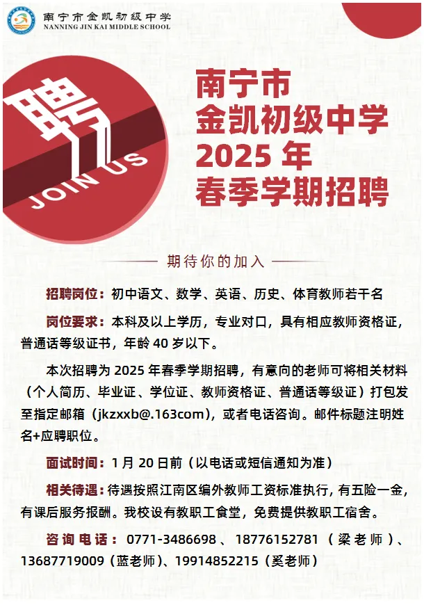 原文標(biāo)題:南寧市金凱初級(jí)中學(xué)2025年春季學(xué)期招聘