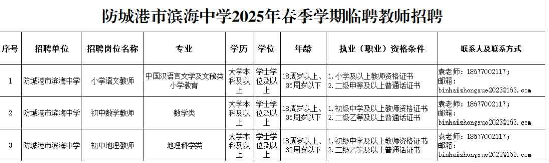 二、報名方式:1.將個人簡歷、學(xué)歷學(xué)位證書、教師資格證等發(fā)到郵箱:binhaizhongxue2023@163.com(郵件名稱備注:姓名+崗位+聯(lián)系方式)2.聯(lián)系電話:袁老師/18677002117