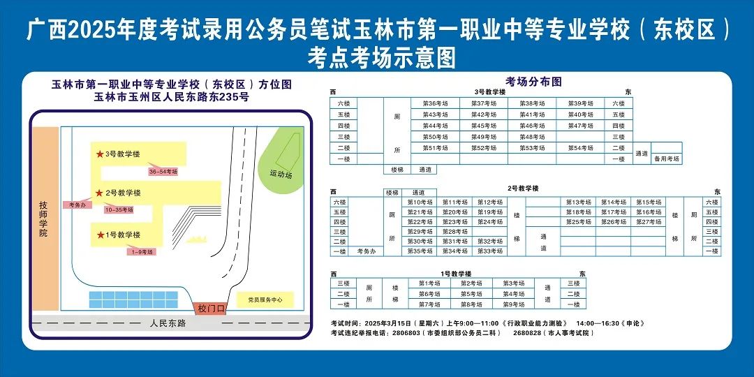 請?zhí)崆傲私獗救怂诳键c具體位置,熟悉考點周邊情況,特別是考點周邊的食宿、交通情況,合理做好食宿安排和出行計劃。需要特別注意的是:玉林市第一職業(yè)中等專業(yè)學校考點是設在該校的東校區(qū)(人民東路東235號);玉林市第一中學考點是設在該校的運嶺路校區(qū)(二環(huán)北路1228號)!