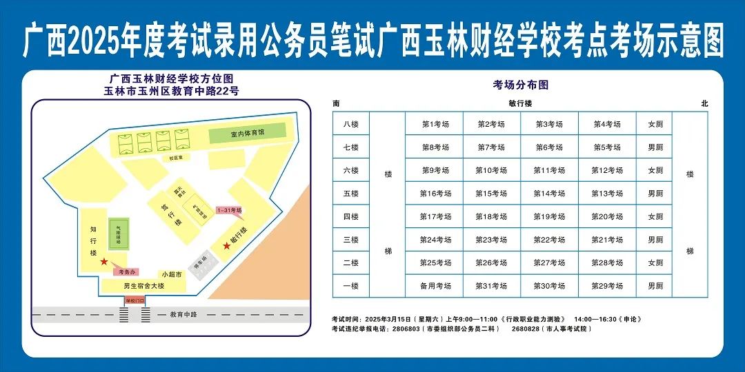 廣西2025年度考試錄用公務員(選調生)筆試將于3月15日舉行,為進一步提升玉林考區(qū)服務保障質量,現(xiàn)就有關注意事項提示如下,請廣大考生做好應試準備工作,準確掌握考試時間、考點地址及相關注意事項。