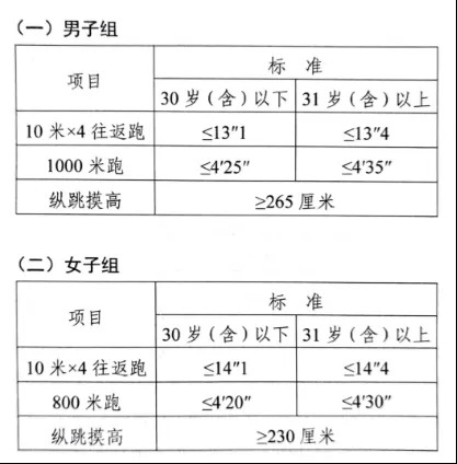 參照《公安機關錄用人民警察體能測評項目和標準》的項目及測試規(guī)則開展體能測評,本次體能測評的項目和標準如下: