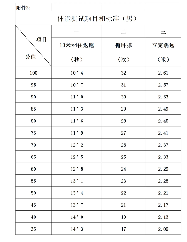 3.體能測試。參照人民警察招錄標(biāo)準(zhǔn)執(zhí)行(具體項(xiàng)目和標(biāo)準(zhǔn)詳見附件2)。測試項(xiàng)目:10米×4往返跑、立定跳遠(yuǎn)、俯臥撐,體能測試三項(xiàng)全部達(dá)標(biāo)的,方為合格。