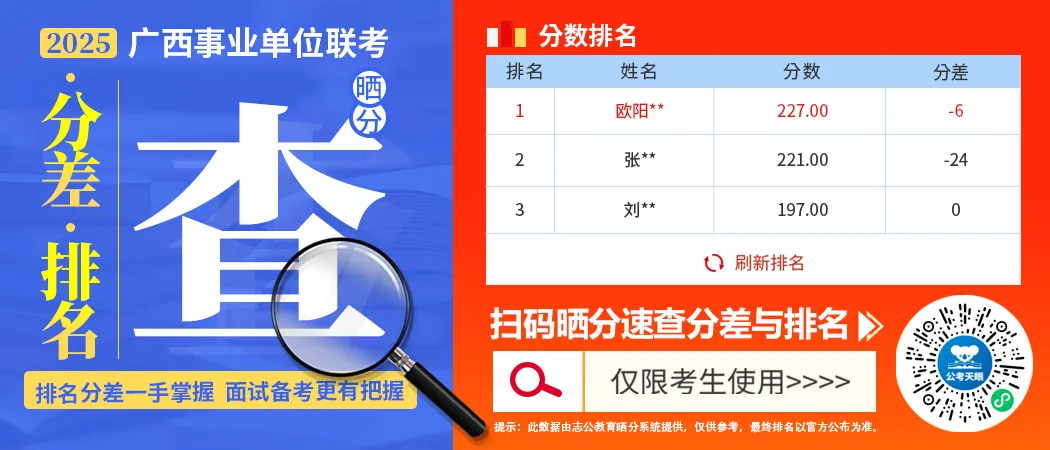 還是想要自己崗位對(duì)手與自己的筆試分差? 志公教育重磅推出 廣西事業(yè)單位排名、分差查詢系統(tǒng) 在線曬成績(jī) 知曉自己在崗位中的競(jìng)爭(zhēng)力 方能針對(duì)性備考 曬出你的分?jǐn)?shù)崗位排名丨與對(duì)手分差一目了然 剩余地市面試名單陸續(xù)發(fā)布 識(shí)別下方二維碼|速查排名、分差。
