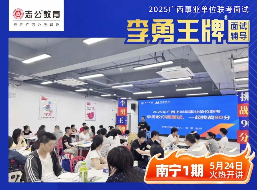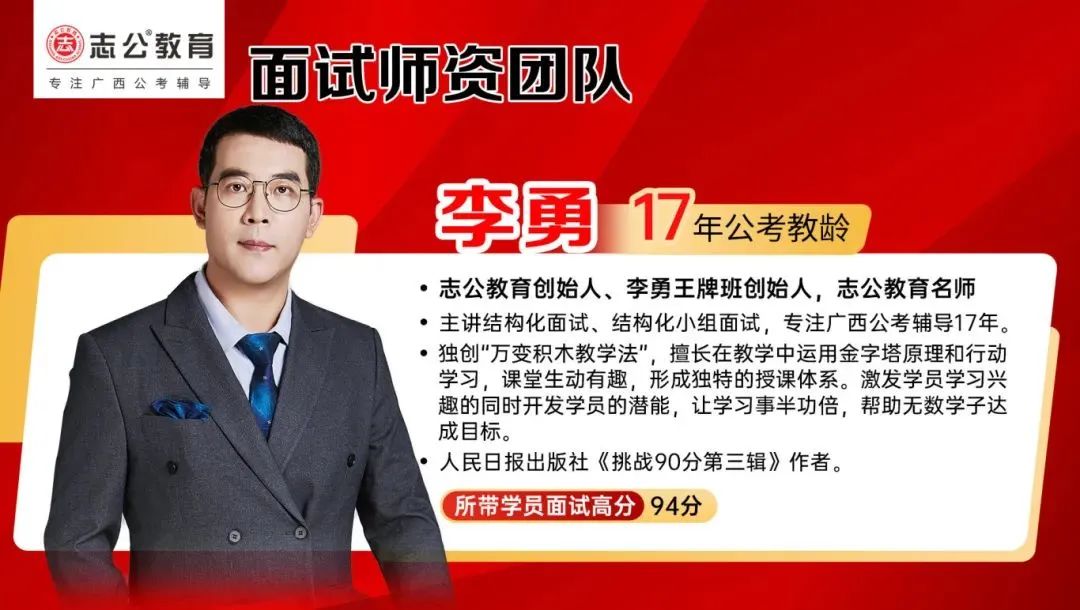 李勇——志公教育創(chuàng)始人、李勇王牌®班創(chuàng)始人,志公教育名師。主講結(jié)構(gòu)化面試、結(jié)構(gòu)化小組面試,專注廣西公考輔導(dǎo)17年。獨創(chuàng)“萬變積木教學(xué)法”,擅長在教學(xué)中運用金字塔原理和行動學(xué)習(xí),課堂生動有趣,形成獨特的授課體系。激發(fā)學(xué)員學(xué)習(xí)興趣的同時開發(fā)學(xué)員的潛能,讓學(xué)習(xí)事半功倍,幫助無數(shù)學(xué)子達成目標。同時也是人民日報出版社《挑戰(zhàn)90分第三輯》作者。