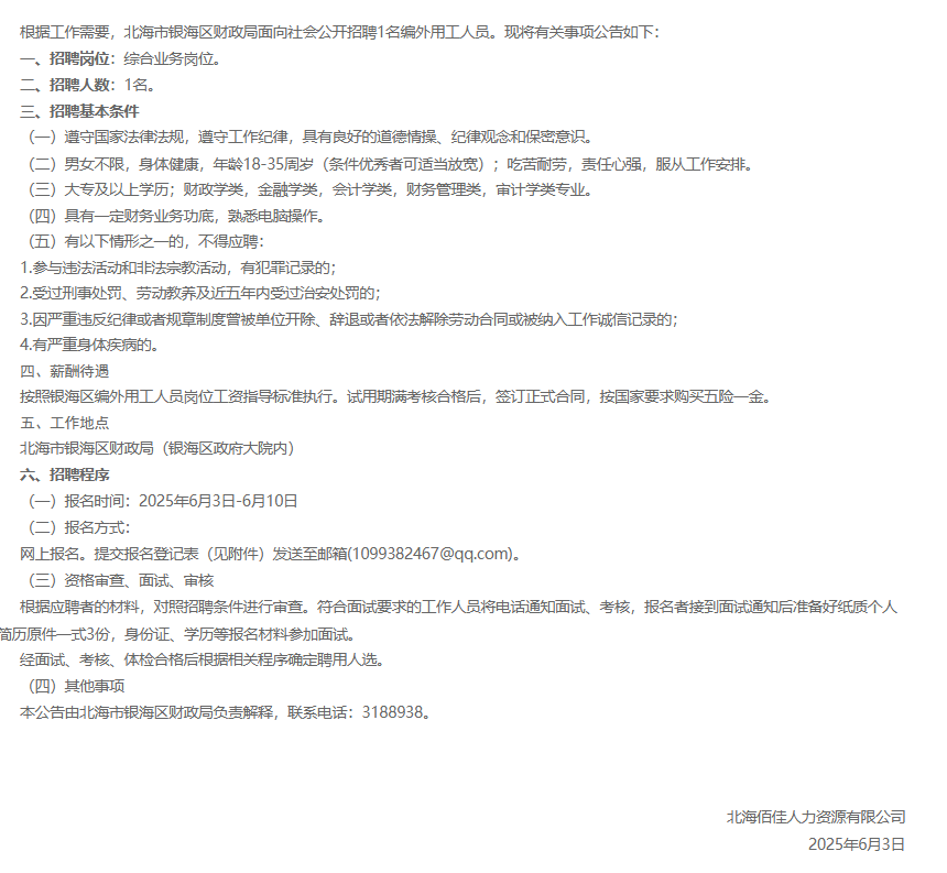 原文標(biāo)題:(截止至6月10日)北海市銀海區(qū)財(cái)政局招聘編外用工人員公告