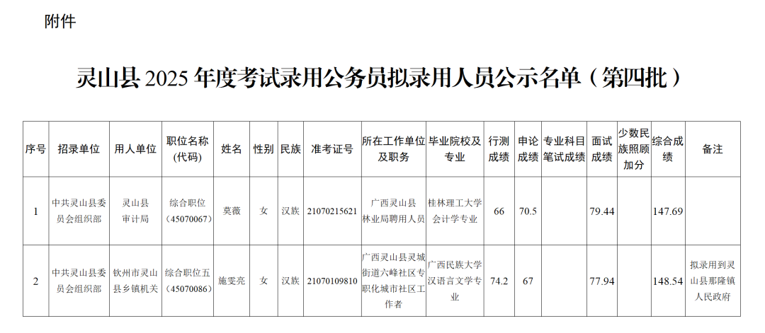 12 欽州市2025年度考試錄用公務員擬錄用人員公示(四)