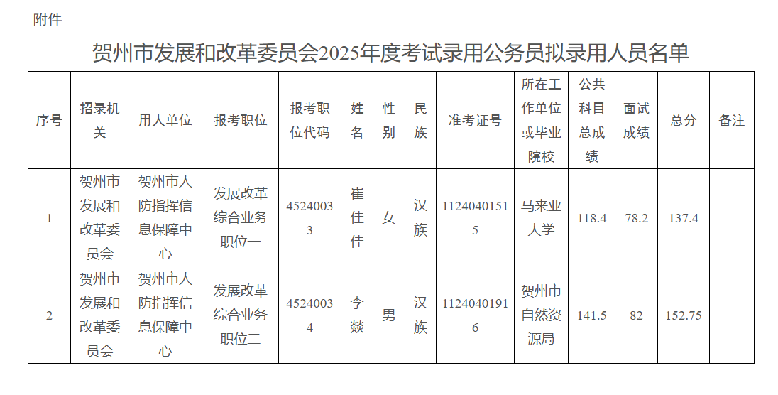 附件:賀州市發(fā)展和改革委員會2025年度考試錄用公務員擬錄用人員名單