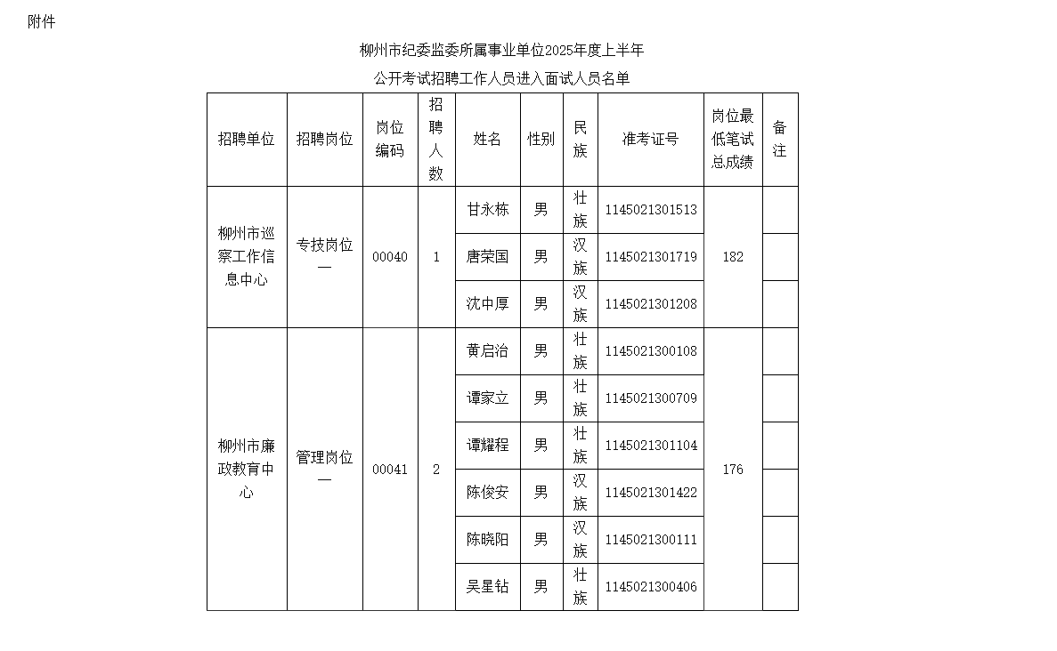 附件:《柳州市紀(jì)委監(jiān)委下屬事業(yè)單位2025年度上半年公開考試招聘工作人員進(jìn)入面試人員名單》