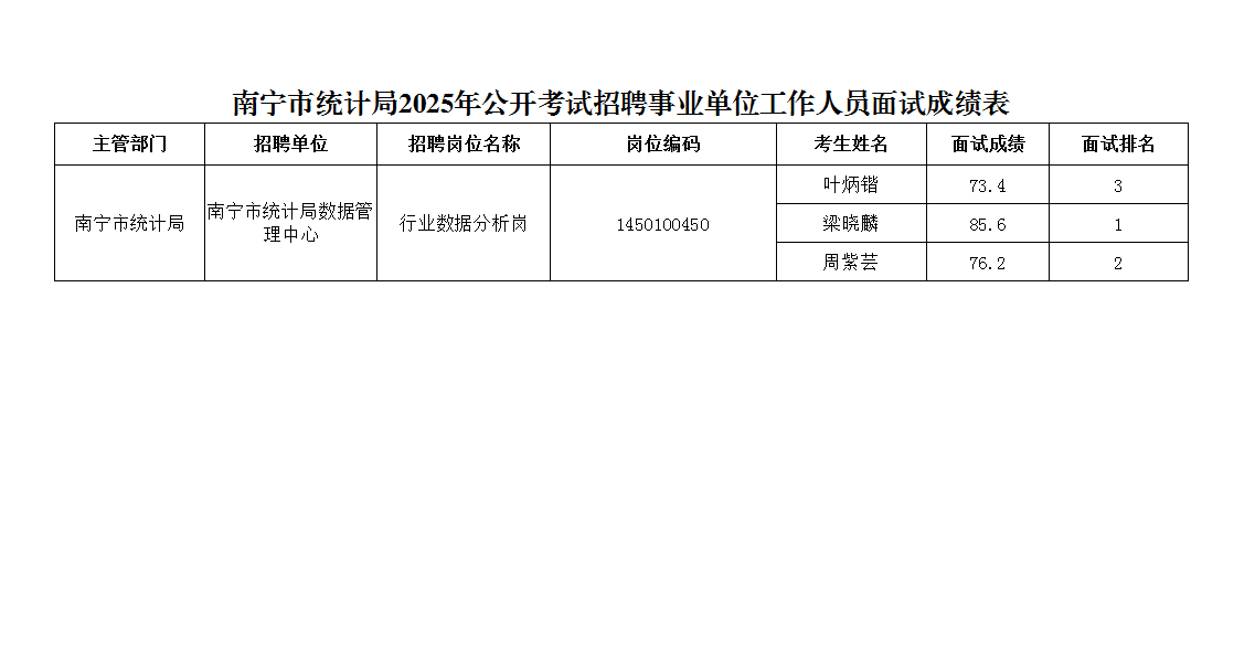 南寧市統(tǒng)計(jì)局2025年公開(kāi)考試招聘事業(yè)單位工作人員面試成績(jī)表