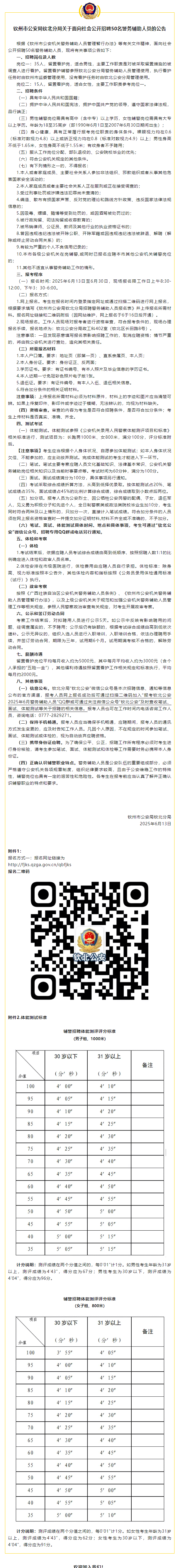 欽州市公安局欽北分局關于面向社會公開招聘50名警務輔助人員的公告