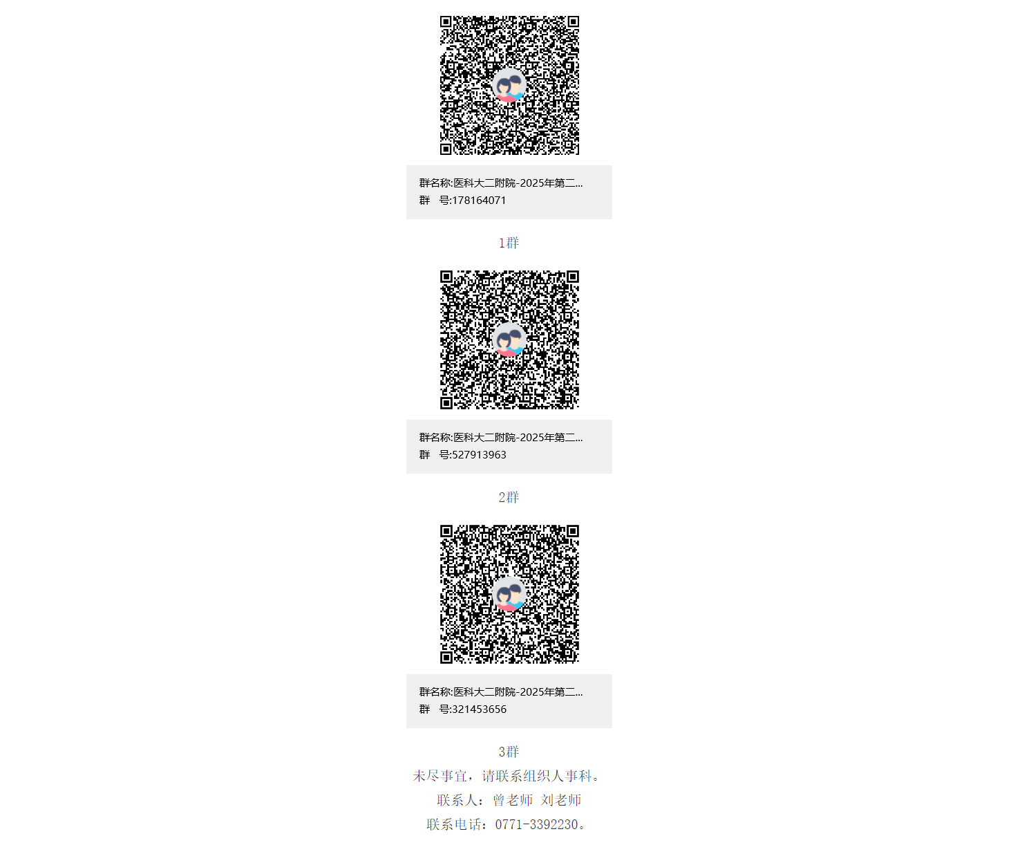 考核與面試的時(shí)間、地點(diǎn)另行通知,擇優(yōu)聘用。通過(guò)資格審核的考生名單及相關(guān)考試事宜將在“醫(yī)科大二附院-2025年第二批醫(yī)技藥行政招聘群”發(fā)布,請(qǐng)應(yīng)聘者務(wù)必進(jìn)群并關(guān)注群消息,不再另行通知。請(qǐng)通過(guò)搜索群號(hào)碼(1群:178164071、2群:527913963、3群:321453656)或掃碼加群(1群滿(mǎn)后請(qǐng)加2群、3群):