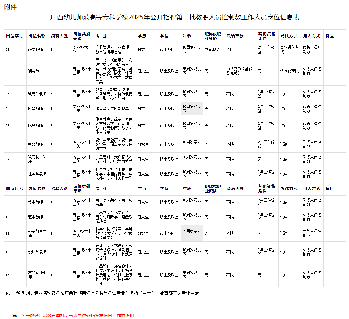 本次公開招聘工作人員26名,具體招聘崗位及要求詳見《廣西幼兒師范高等??茖W校2025年公開招聘第二批教職人員控制數(shù)工作人員崗位信息表》(附件)。