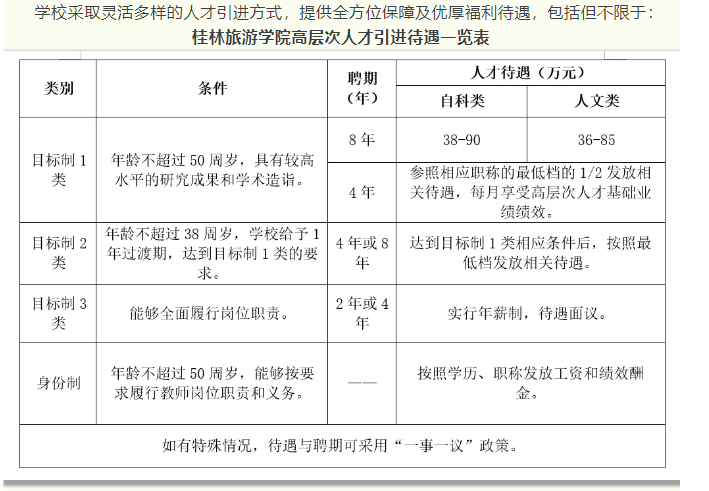 4.根據(jù)自治區(qū)政府文件要求,符合相應(yīng)條件者,學(xué)校積極配合申請(qǐng)廣西壯族自治區(qū)高層次人才認(rèn)定和各類人才項(xiàng)目,若入選可享受各類優(yōu)厚的人才待遇,詳情請(qǐng)登錄廣西高層次人才“一站式”服務(wù)平臺(tái)(http://www.gxrc.org/)查閱。首次來桂工作的35歲以下、具有博士學(xué)位的青年人才,可按照政策申領(lǐng)自治區(qū)青苗人才普惠性支持。如入選桂林市高層次人才,還可以享受桂林市高層次人才有關(guān)津貼、購(gòu)房補(bǔ)貼和個(gè)稅獎(jiǎng)勵(lì)等人才補(bǔ)助。詳見桂林市高層次人才一站式服務(wù)平臺(tái)(https://gcc.glrcw.com/)。