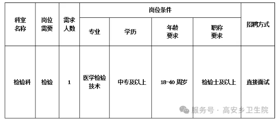 來賓市興賓區(qū)高安鄉(xiāng)衛(wèi)生院是一家集醫(yī)療、預防保健、康復醫(yī)療于一體的國家公立基層醫(yī)療機構,現(xiàn)有職工45人,服務人口約2萬人。因工作需要,我院擬向社會公開招聘編制限額外檢驗科人員1名,現(xiàn)將有關招聘事項公告如下: