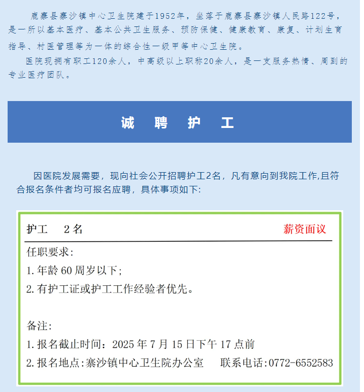 2025年鹿寨縣寨沙鎮(zhèn)中心衛(wèi)生院公開招聘護(hù)工公告
