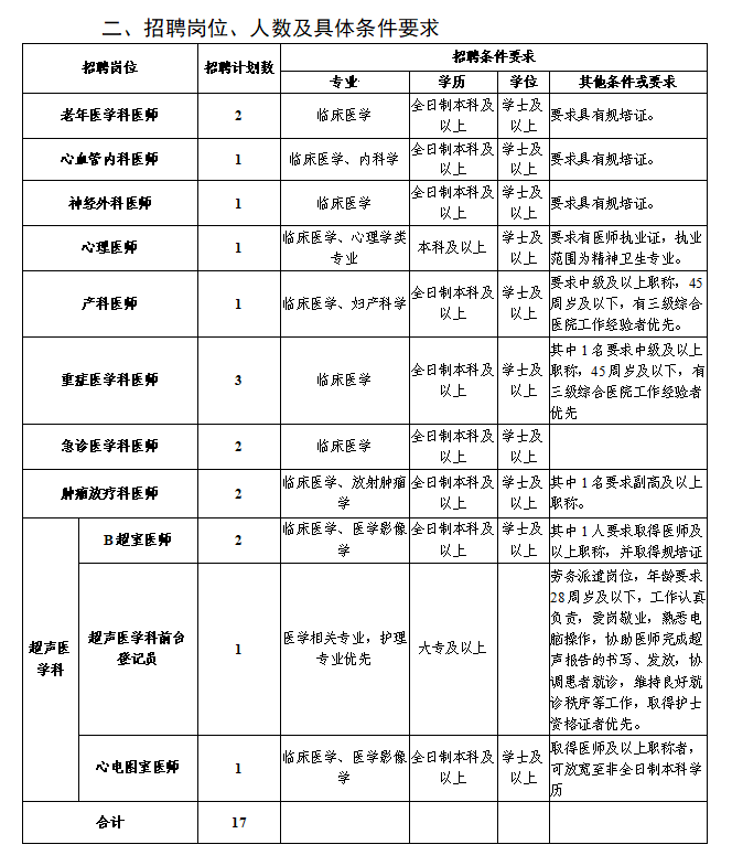 注:初中級(jí)職稱(chēng)應(yīng)聘人員原則上年齡要求為35周歲及以下;如為副高以上職稱(chēng),年齡可放寬至45周歲;學(xué)歷層次高者優(yōu)先。醫(yī)師崗位中如要求具有規(guī)培證條件的是指已取得規(guī)培合格證書(shū)(含通過(guò)規(guī)培結(jié)業(yè)考試未領(lǐng)合格證書(shū))或已取得中級(jí)及以上職稱(chēng)人員。