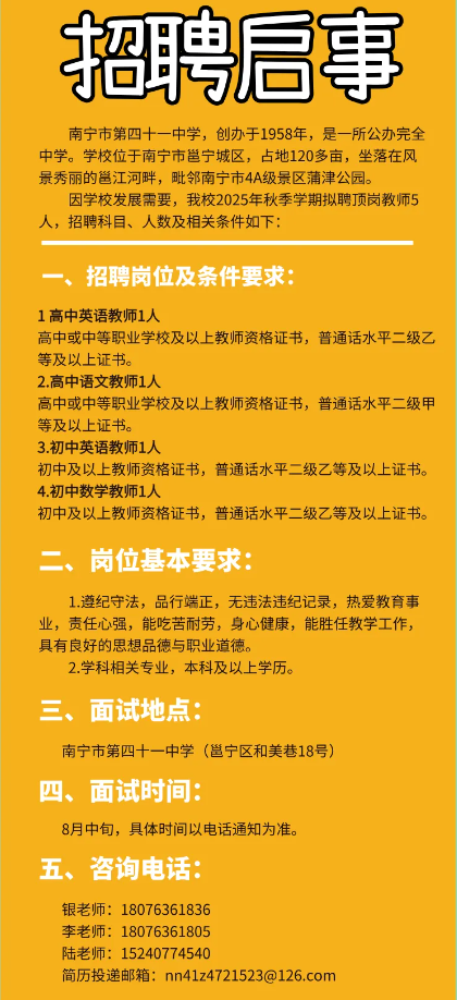 原文標(biāo)題:2025年秋季學(xué)期南寧市第四十一中學(xué)關(guān)于公開(kāi)招聘頂崗教師的啟事