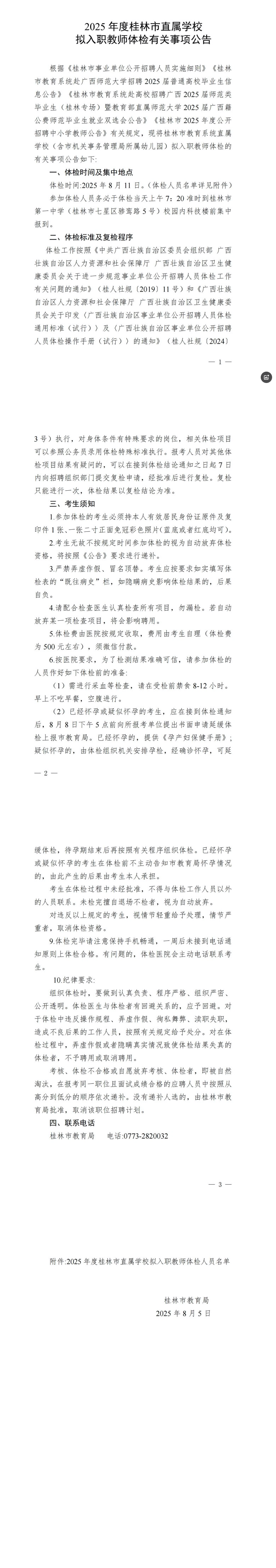 2025年度桂林市直屬學校擬入職教師體檢有關事項公告