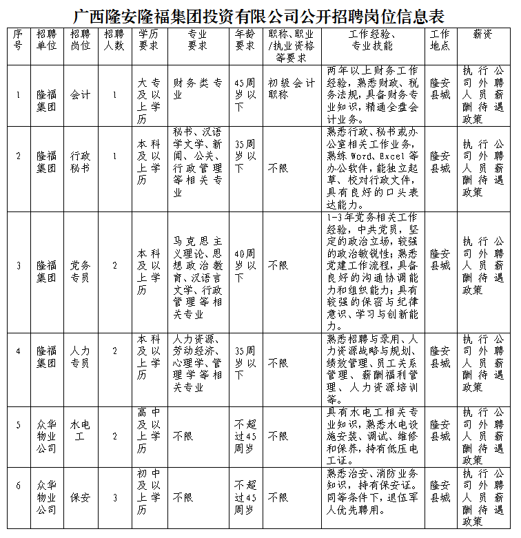 廣西隆安隆福投資集團有限公司(以下簡稱“隆福集團”)是隆安縣人民政府國有獨資企業(yè),注冊資本5億元人民幣。負責縣本級基礎設施建設、產業(yè)發(fā)展和公共服務等投融資、建設、運營管理及國有自然資源開發(fā)、建設、運營等工作。因工作需要,現面向社會公開招聘數名外聘工作人員。