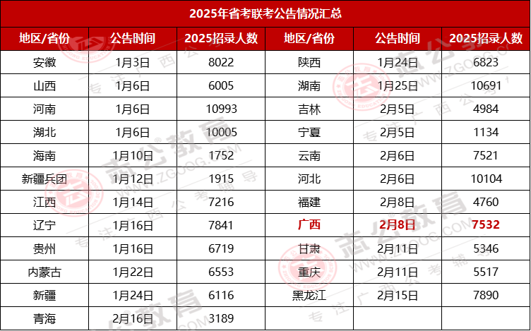 由廣西壯族自治區(qū)公務(wù)員局發(fā)布,核心查詢平臺(tái)為八桂先鋒網(wǎng)、廣西人事考試網(wǎng),也可在各市黨建網(wǎng)、人事考試相關(guān)平臺(tái)查看。2025年公告發(fā)布時(shí)間為2月8日。