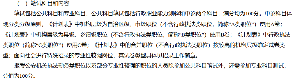 公共科目為行政職業(yè)能力測(cè)驗(yàn)(100 分)、申論(100 分)。申論分 A/B/C 卷:自治區(qū) / 市級(jí)職位(非行政執(zhí)法類(lèi))用 A 卷;縣 / 鄉(xiāng)鎮(zhèn)級(jí)職位(非行政執(zhí)法類(lèi))用 B 卷;行政執(zhí)法類(lèi)職位用C卷。