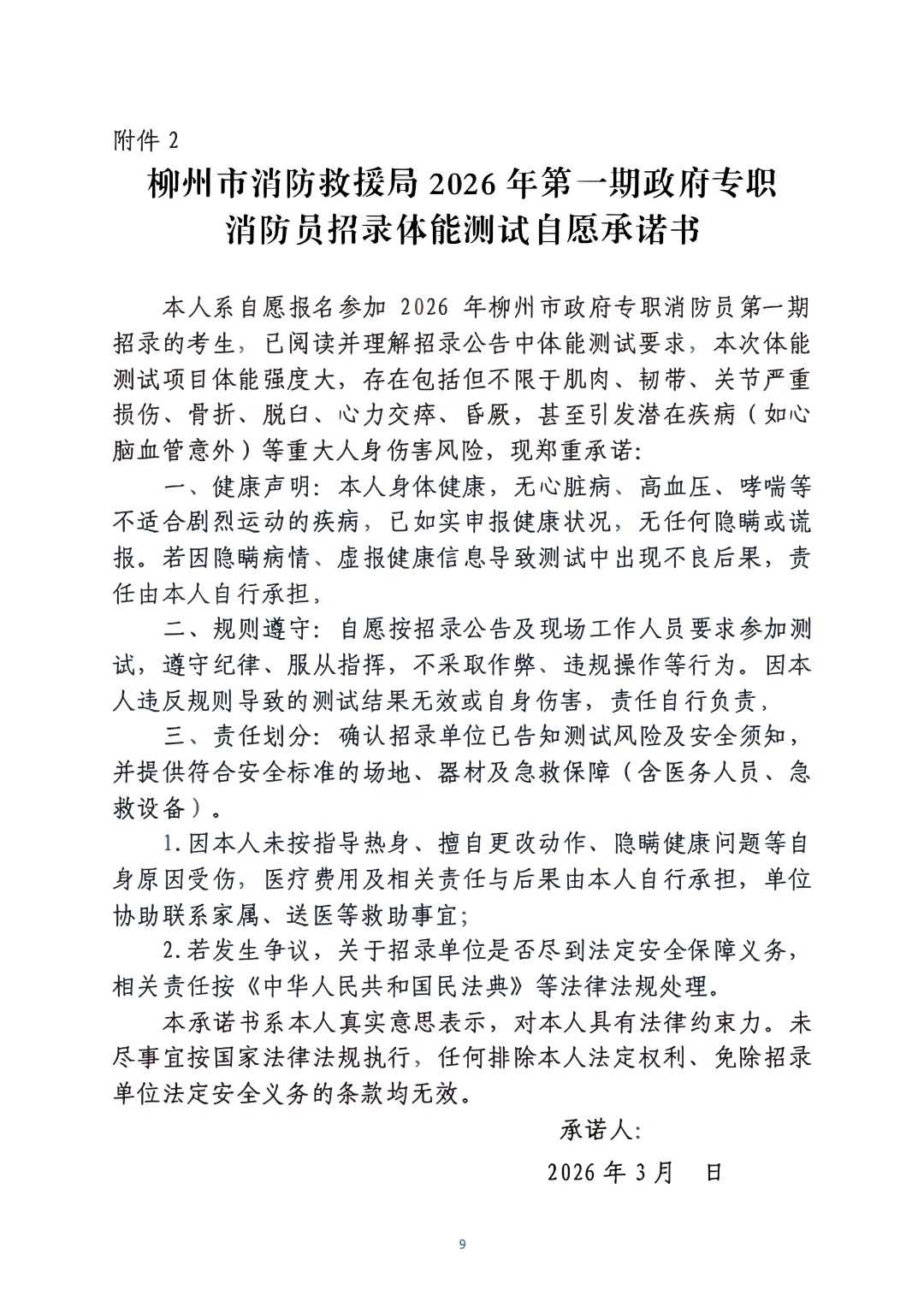 考生在體能測(cè)評(píng)前需簽署體能柳州市政府專(zhuān)職消防員第一期招錄體能測(cè)試承諾書(shū),拒絕簽署的不予進(jìn)行考核詳見(jiàn)(附件2)。
