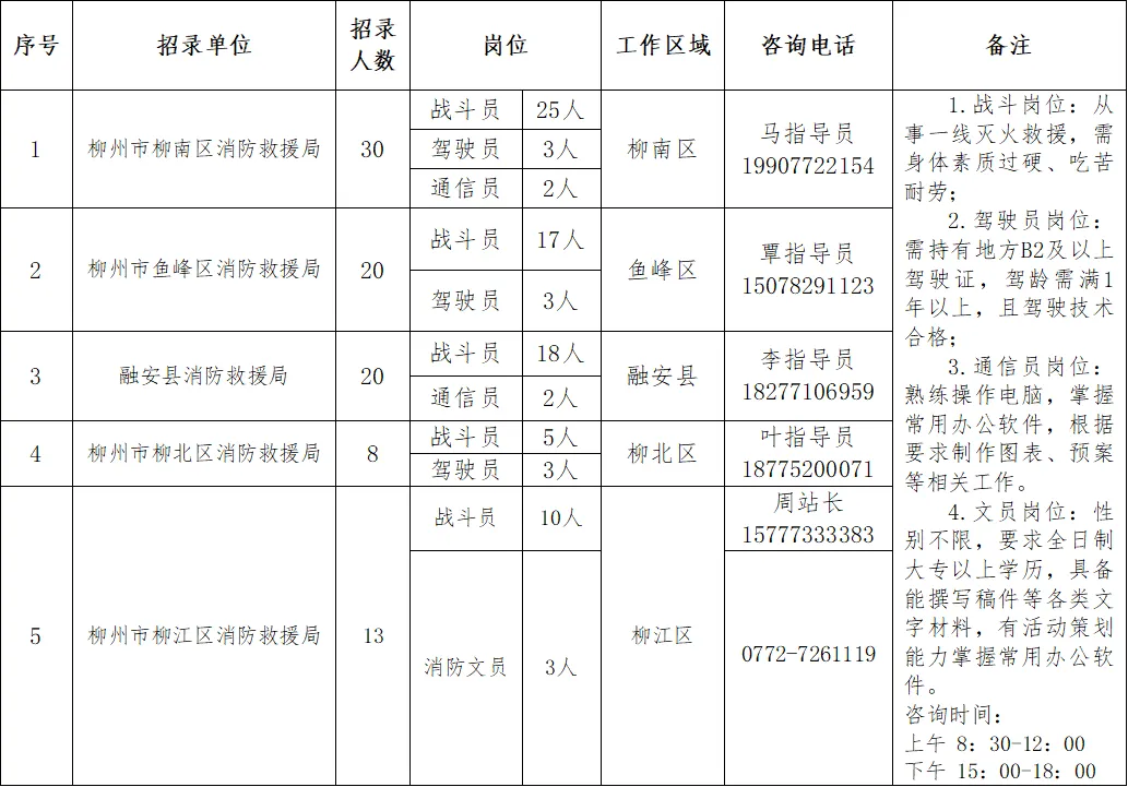 政府專(zhuān)職消防員91人。崗位要求:男性,身高165CM以上,雙眼裸視力4.8以上,需具備高中(中專(zhuān))以上學(xué)歷,年齡為18-28周歲以下(有部隊(duì)服役經(jīng)歷或者全日制大專(zhuān)及以上學(xué)歷可放寬至30周歲),身體素質(zhì)過(guò)硬、吃苦耐勞、心理健康,無(wú)遺傳性、傳染性和慢性疾病,符合體檢標(biāo)準(zhǔn)。