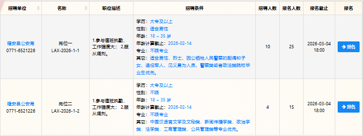 附件:1. 隆安縣公安局2026年度公開招聘警務輔助人員職位計劃表