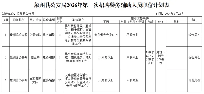(一)招聘人數(shù):30人,詳見《象州縣公安局2026年第一次公開招聘警務(wù)輔助人員職位計(jì)劃表》(附件1)